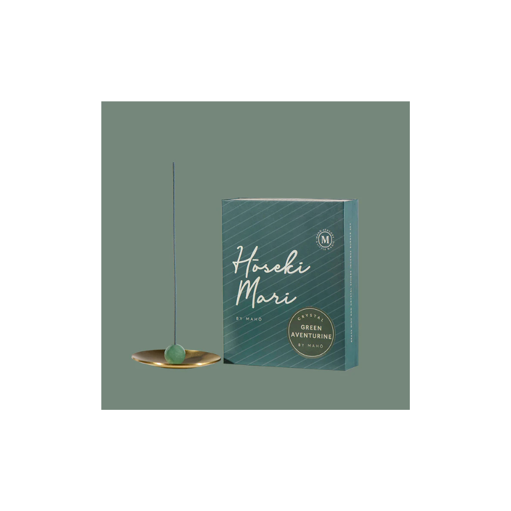 A handcrafted incense holder combining a brass dish with a green aventurine crystal. Designed to direct smoke energy for a healing, ceremonial cleanse.