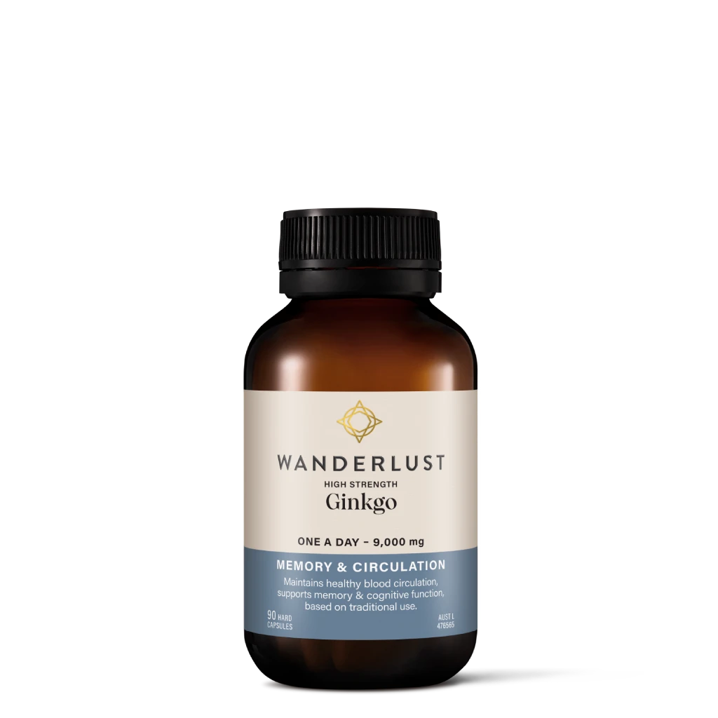 WANDERLUST High Strength Ginkgo is a consciously created, plant-active supplement designed to support cognitive health. Formulated with a high-strength dose of Ginkgo biloba, it is traditionally used in Western Herbal Medicine to enhance cognitive function, improve memory and recall, and promote healthy blood circulation. As a natural source of antioxidants, it also helps to reduce free radical damage in the body.